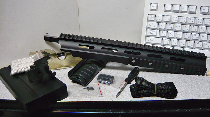 レイルをはずした状態。この姿の方が見慣れた感があります。パッと見は結構イケてませんか?この状態ならリヤサイトからフロントサイトもちゃんと見えるので狙って撃つ事が出来ます。