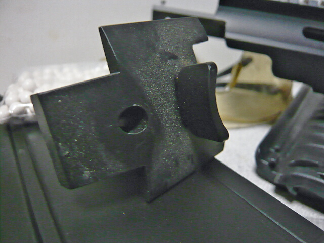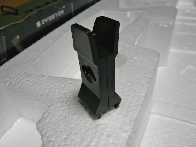 フロントサイト。銃側の基部に差し込むだけですがこちらはロックのための引っ掛かりが付いていてパチッとロックできますがまあ、当然のようにグラグラぶれます。