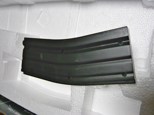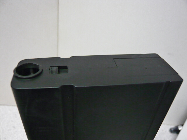 上面にスライドするフタがあり、ここから弾をリザーブスペースへジャラジャラ流し込み、マガジンフォロワーを一番下でロックさせてマガジンを振りフォロワーの通る通路へ弾を出すのが本来の使い方ですが、あまりに前時代的でやりにくい・・・フタから奥をのぞくと錆びた鉄棒がウェイトとして入っておりマガジンはマルイの電動M4用ノーマルマガジンくらいの重さがあります。マガジン底面は何のディテールもなく残念な感じ。