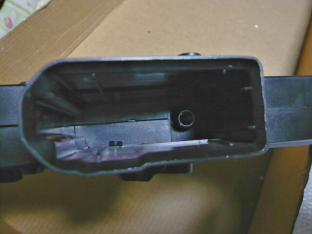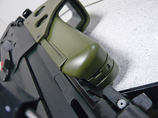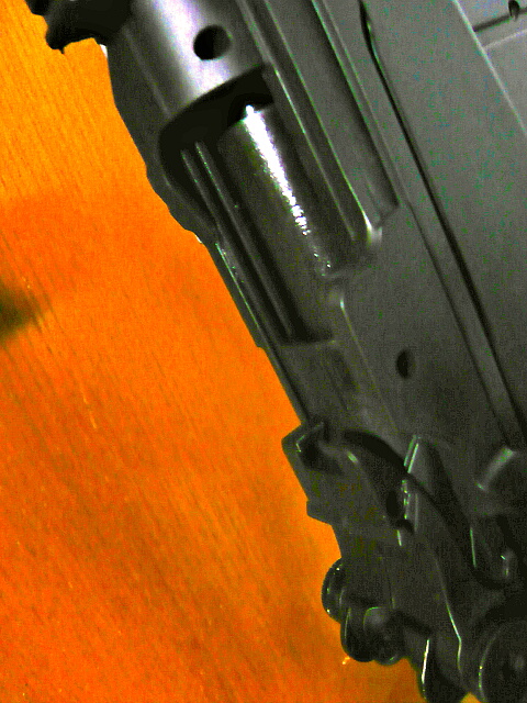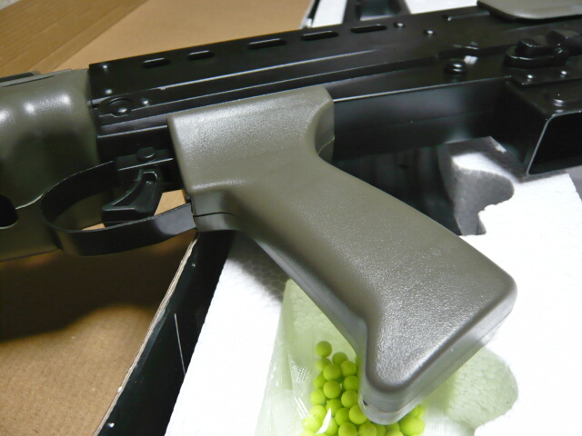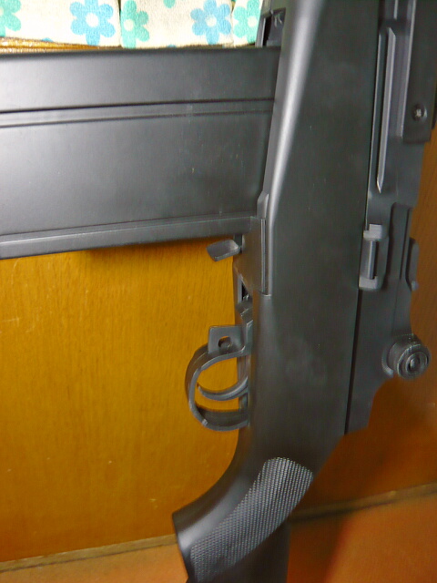 重量もなりの大きさに対し羽のように軽く(およそ4~500gくらい)、全体的に安っぽいです。しかし表面はサンドブラストっぽくつや消しになっているし、ハンドガードやレシーバーはシボ加工されています。パーティングラインやゲート跡の処理はおざなりですがディテールの角などはカッチリ立っていて、意外に侮れません。