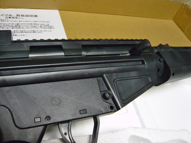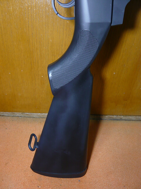 ストックには重りが仕込んであるようで結構ここが重いのですが、前後バランスは取れています。グリップは曲銃床ならではのもので、右側面にコッキングレバーがある場合は握ったり離したりがしやすいものの、どうもバットプレートを肩につけた時に脇が大きく開いてしまったり慣れない感じ。バットプレートは軟質プラ製でストック後端に被さっているだけで、下側からこじると引っぺがせます。