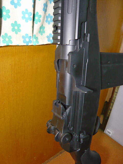 コッキングハンドルはG3/MP5系では本来ハンドガードの左上、ガスパイプ左にありますがこの銃は何故かエジェクションポートから生えています。AK系に慣れた人にはこっちの方がやりやすいのでしょうか?