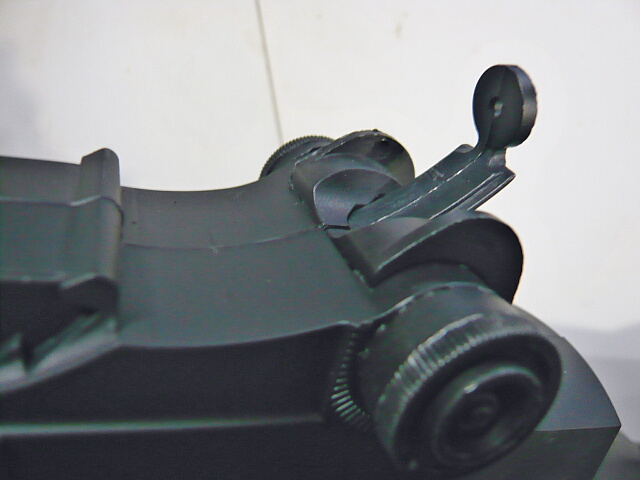 リヤサイトは特徴的なドラム型サイトの形をしていますがピストルサイトタイプ(凹型の溝の中央にV字)で固定されています。しかし上からレイルがかぶせられており、リヤサイトの周りを覆うボックス状の前面が塞がっているというヘボい処理でそのままではフロントサイトが見えません・・・