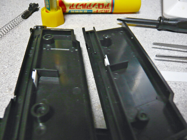 0.5mmプラ板の小片を貼って一箇所空いた穴を塞ぎます。リザーブ側へBB弾が通らなくなりさえすればOK。