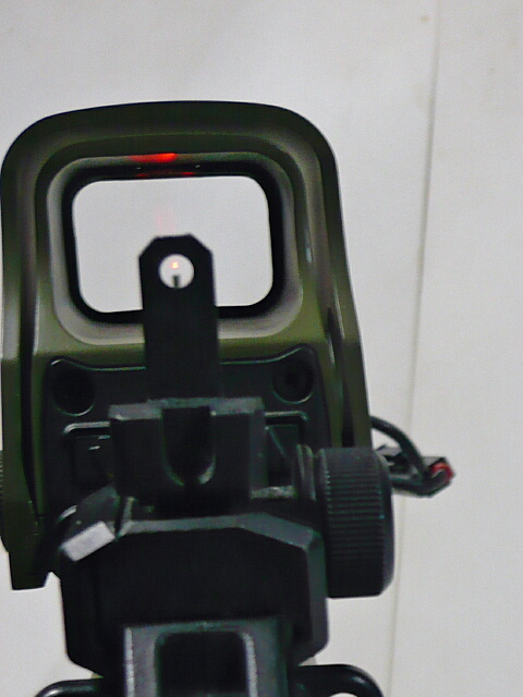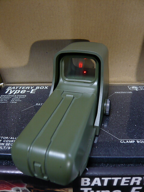 これはミリタリーなルックスのホロサイトのベース部分に8.4Vミニバッテリーを納めるバッテリーボックスとしての機能だけではなく、調整機能こそ省かれているものの一応ドットサイトとしての機能を残されています。