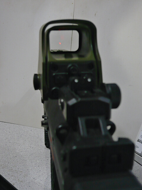 左側のダイヤルを回すとピープサイトが延びてきてここまで持ち上げられます。光学サイトなんて持ってないよ・・・という人はこのくらいまで伸ばしてなんとかFサイトを見えるようにすると良いでしょう。近距離ならこれでも割と十分狙ったところへ行くようです。