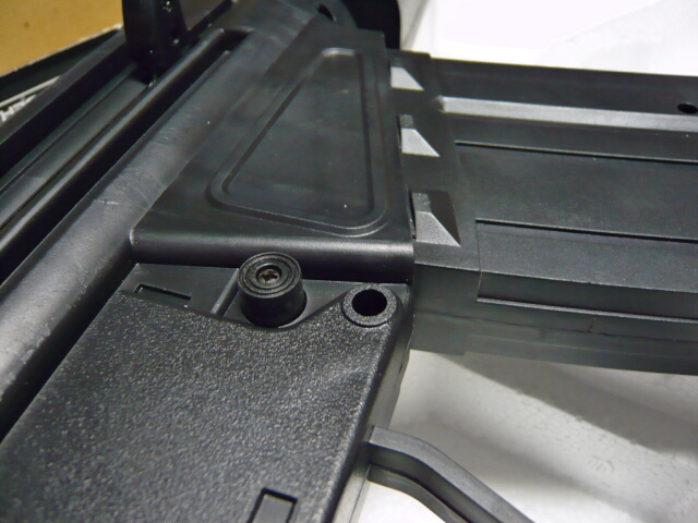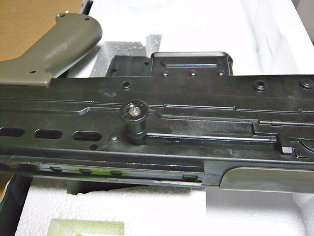 ええもう、発泡スチロールから取り出した途端中華クオリティの応酬!バリ、バリ、とにかくバリだらけ!左右モナカもズレまくりです。組み立てる前にまずバリをカッターで削り取ってやる作業から始まります。ちなみに上画像真ん中ちょっと右の突き出てるネジっぽいのはホップアップ調整ダイヤルで、少しねじ込んでおかないと銃床と干渉するのであらかじめねじ込んでおきましょう。別に金属至上主義ではなくポリマーフレームとか好きな方ですがもうちょっとこう・・・まあ6千円6千円・・・