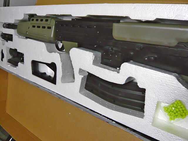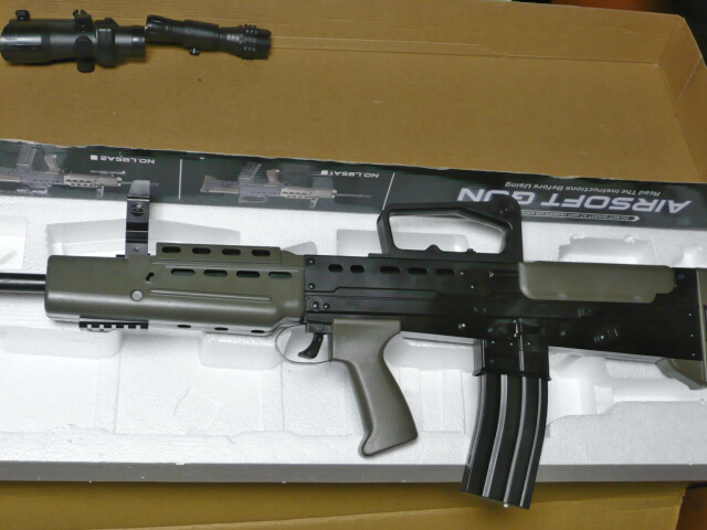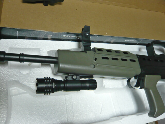 メーカー名の記載が箱のどこにも無く、中国製品は製品の特定が難しい・・・でもハンドガードの下にライト下げてるL85があったらコレだと思います。4千円ほどでした。