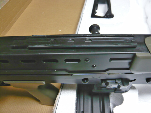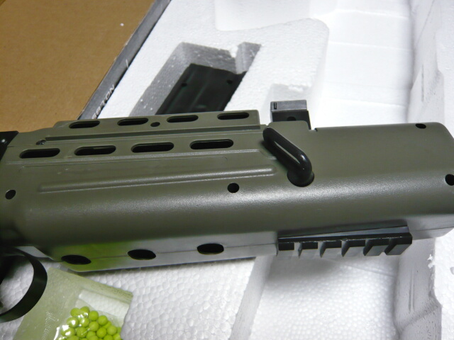 RASをとりつけ、レイルカバーも装着。RASはプラ製でやはりバリだらけ、レイルカバーはホコリで汚いです・・・レイルカバーはロック金具がチャチできちんと固定できずカチャカチャブレて収まりが悪いです。位置ももっと後ろならともかくこんな前の方にカバー付ける意味が無い気がするので使う使わないは好みで。