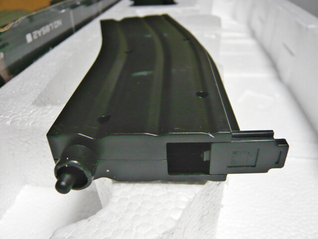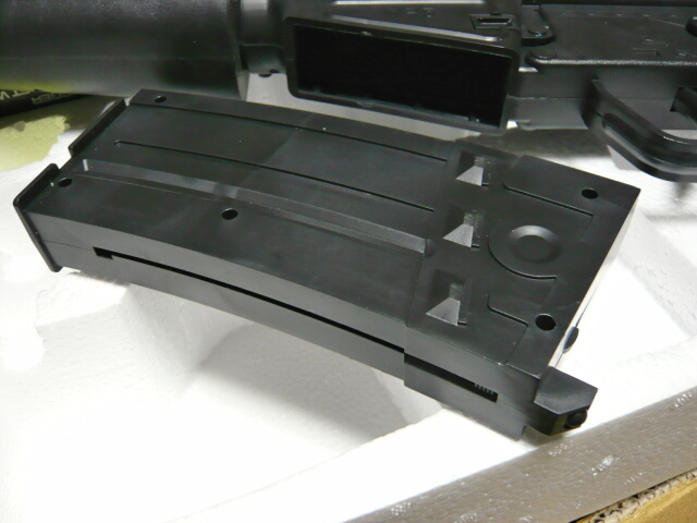 マガジンはM4系と同じ形状のものですが構造はトイスターと似ており、マガジンフォロワーが前面に露出している単列の部分と、それ以外のリザーブ部分とで一箇所穴で繋がっているという構造。リップ開放レバーが無いので詰めた弾を取り出しにくく、またリップ位置が奥まっているので1発づつ手で込めるのもやりにくいです。