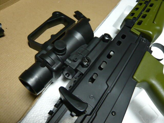 ACOGを銃本体に装着。こちらはちゃんとレイル取り付け用のネジが付いています。ただ一杯に締めても緩く後ろからスイッチONするとACOGが前にズルッと動いてしまいます。