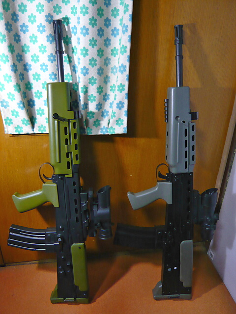 トイスターL85A2と中華製L85A2。並べるとオリーブドラブの色合いが全然違いますね。