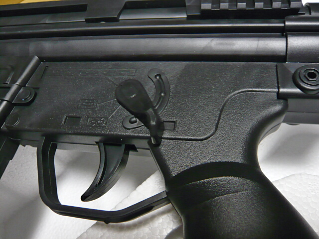 レシーバーやセレクターレバーはG3準拠ですが、MP5A4以降の印刷でされているアイコンタイプが浮き彫り刻印で表現されています。マークは上からフル・セミ・セーフですがレバーは上に上がってる位置でセーフなのでちょっと紛らわしい。MP5系後期のレシーバーが実際こういう表示なのでこのトイガンが悪いわけではないのですが。レバーは操作しやすい適度なクリックのあるマルイのエアコキMP5A3と似たタッチ。グリップの握り心地もG3よりはMP5A3に似ています。