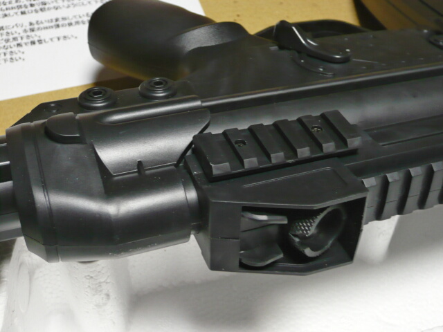 右側面にネジ穴が大量にあり、あまり分割は凝っていません。ハンドガードも左右だけで上のカバーも一体になっています。下にはレイルがあるのでここはちょっと便利。スリングスイベルはトイスターのものとは逆で右側面にあります。