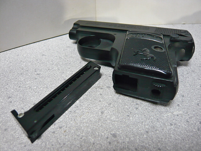 ただ?をつけるまでもなく90年代中頃にマルシンからブリスターパック入りで廉価で売られていたコンパクトガスガンのラインナップの中にもこのコルト25オートがあり、外観や構成ももろマルシンのそれで、カッチリ角の立った見た目だけは良いプラスチックのモナカ外装に特徴的な仕上げの亜鉛ダイキャストのトリガー、セーフティ、マズルキャップ、割り箸マガジン、ダブルアクション動作で内蔵されたハンマーがバルブを叩きガスを放出、10禁程度のパワーで6mmBB弾を発射するという、あのシリーズに共通する構成。