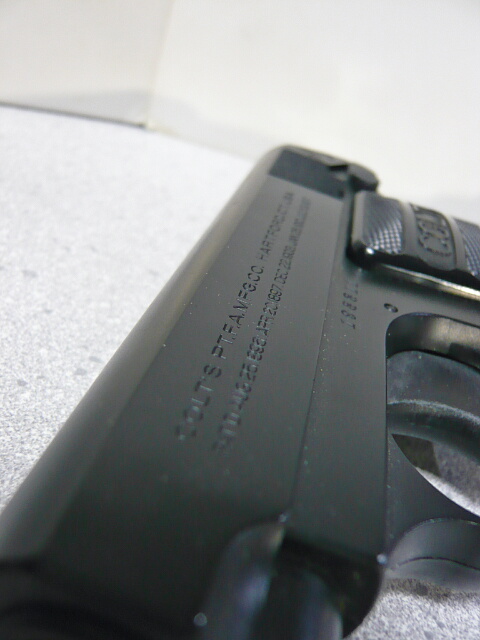廉価でちっさい銃ですが、側面の刻印はマルイのエアコキ等の幅広な彫りに見慣れていると非常に美しく見えます。元がかなり古いトイガンで数もかなり出回っているのにもかかわらず、この角が立ち彫りの深い成形の美しさはさすが。