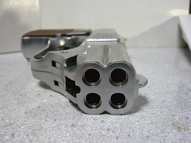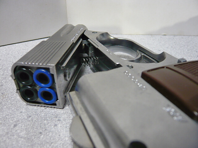 リヤサイトを後ろ側へスライドさせると銃身のロックが外れてこのように上へ持ち上がります。4つあるチャンバーにはゴムパッキンははめられており、ここへ後ろ側から6mmBB弾をを詰めて再び銃身を銃へはめ、ダブルアクション動作のトリガーを引くと発射されます。トリガープルは最初が重くて後が軽く一気に引き切られます。グリップは短いものの太いので小指の居所の落ち着かなさはありますが握りやすいです。
