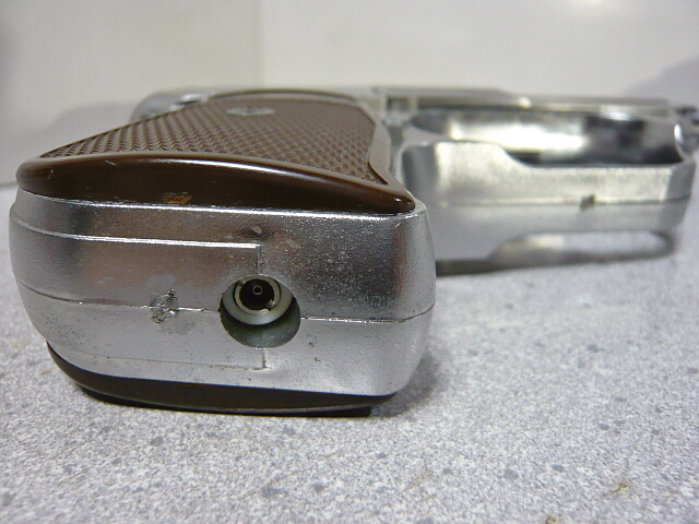 このトイガンはガスガンで、グリップの下にガス注入バルブがあります。この頃のガスガンの注入バルブは各社が思い思いに作っていたせいかガス缶の口金ときっちり適合しないものも多く、このCOP357もマルイのガンパワーHFC134aの口金を当てるとガスは入りこそすれどかなりの量を外にも噴いてしまいます。