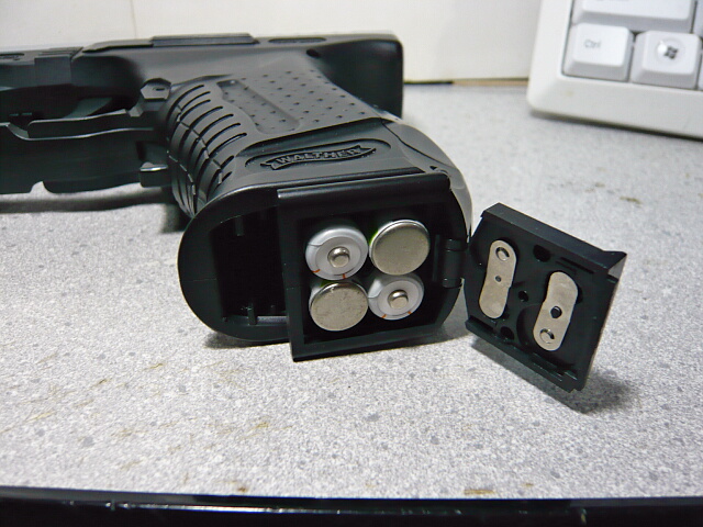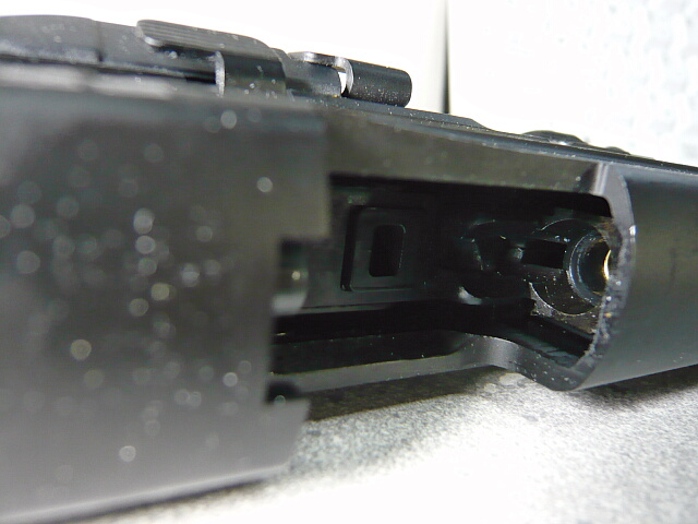 グリップ下面後半は単四電池のスペース。ただこの写真だとニッケル水素充電池が入っていますが、初期のM92FやこのP99では電池ボックスの奥側にあるコイルスプリング状の端子が充電池のプラス端子の出っ張りの周りにある絶縁体に接するよう、いやらしい形状をしているのでそのままでは充電池が使えません。メーカー保証を受けられなくなりますが、充電池を使いたい人はスプリングをラジオペンチなどで楕円形に潰すと使えるようになります。くどいようですが、充電池を使えるように加工をした場合東京マルイで修理を断られる可能性がありますので充電池を使う人は壊れたら捨てる覚悟で。・・・まぁ壊れやしませんけどね。