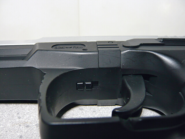 トリガー付け根前方に小さなスイッチがあり、ここがセミ/フル切り替えのセレクターになっています。すぐ上のフレーム側面の刻印もSEMI⇔FULLと表示されています。