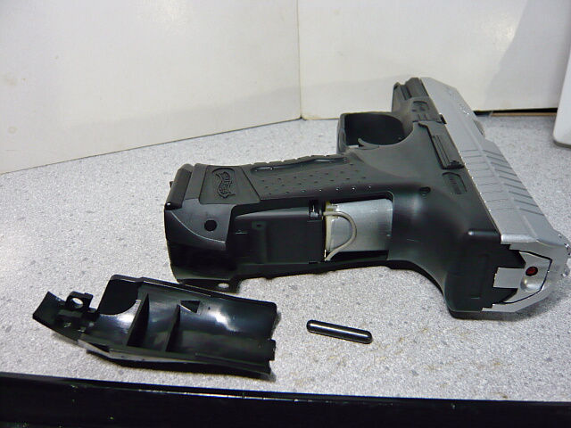 グリップ下方後ろ寄りにあるピンを抜くとグリップ後面がはずれます。ここを交換することで更にグリップを手にあわせることができるのですが、こんなところのパーツはオプションとして用意されていませんし、実銃用や他メーカーのトイガン用が使えるかどうかはわかりません。