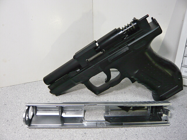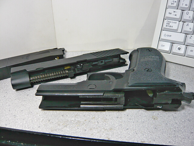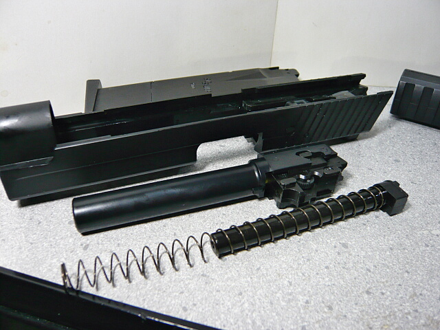 スライドは一杯に引っ張って下から拡げるようにこじってやると簡単にはずせます。この状態でも射撃可能。ただ別にスライドの重さで減速してたりは無いようで、外してもサイクルや音が変わったりはしません。