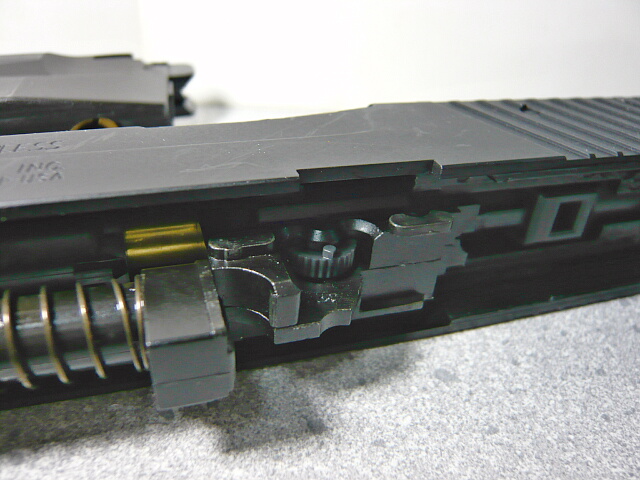 ホップアップの調整はチャンバーの下あたりにある上画像中央の歯車状のダイヤルを回して調整します。調整の度にスライドを外す必要があり、ちょっと面倒かな?テイクダウンのやりやすさがここでは効いてくるでしょう。他の銃だとリコイルスプリングガイドが軽く引っかってるだけだったりしてここが外れてうっとおしい事が多いですが、この銃のリコイルスプリングガイドは後端がチャンバー下にはめ込まれていて一旦前へ縮めてやらないと外れないのでこのあたりは安心。