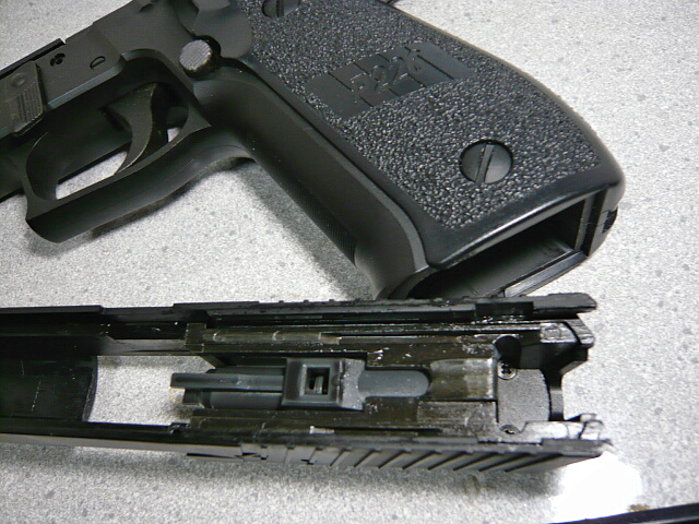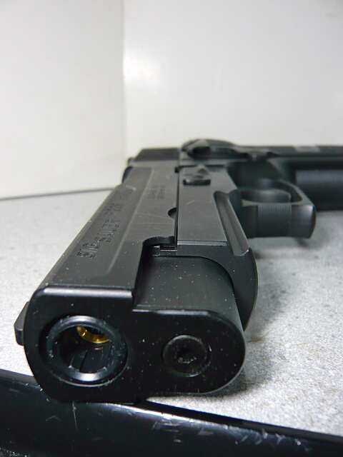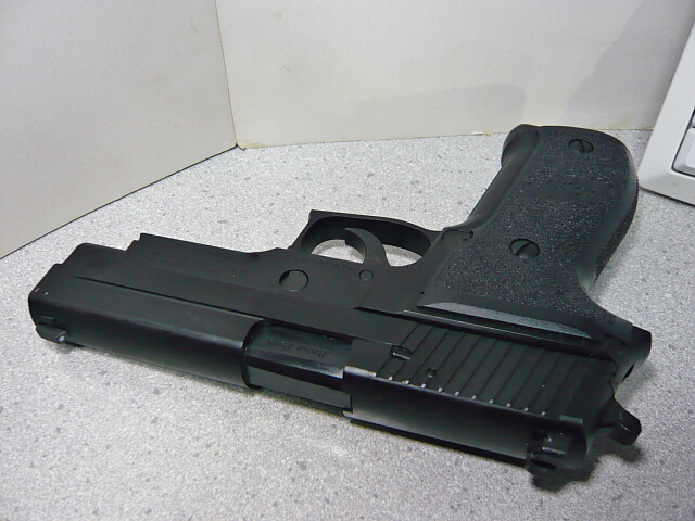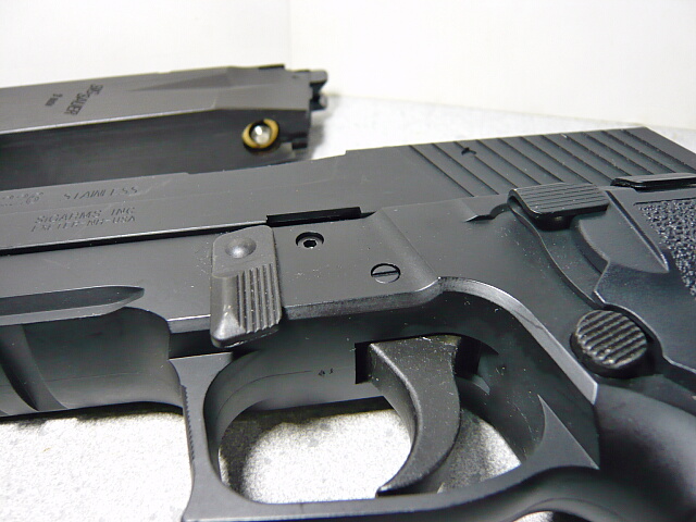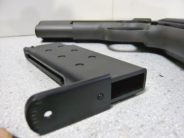 前述の通りマガジンはおそらくはバリエーションに短縮モデルであるP228あたりを加えるつもりで基本部分を共用できるよう、マガジンの下の方に継ぎ目があります。しかし結局今日までP228発売のアナウンスは無く、結局は継ぎ目が無く226専用の継ぎ目の無いマガジンをもつE2が出てしまいました。P228の運命やいかに。