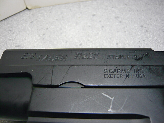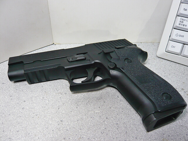 マルイからはすでに改良型のP226E2が発売されていますが、これは旧モデルのP226Rです。違いはE2になってブローバックエンジンが改良され、マガジンの継ぎ目が無くなりガス容量が2割くらい増え、グリップ形状の変更(後面下半分が真っ直ぐに変更、側面のP226マークの削除)、スライドの色がグレーに(226Rは黒)、刻印がリアルな後加工になり右側面前方に白字でE2の印刷、等々。