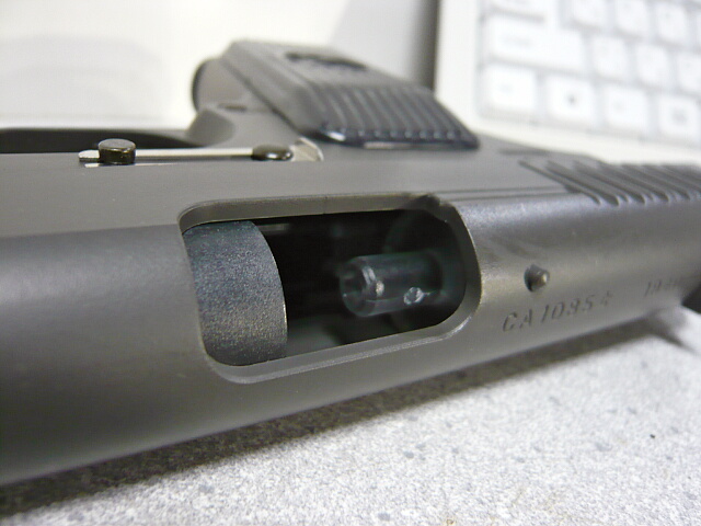 スライドを一杯に引くと空のマガジンが刺さっている状態ならばスライドストップがかかります。ただリリースは固く、リコイルスプリングが不必要に強いように思えます。スライドの引きも重いですが、銃口下の部分に人差し指を掛けて引くとコッキングしやすいです。