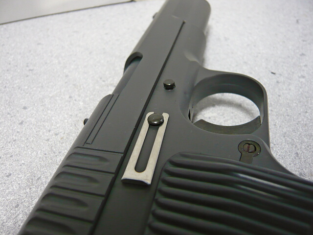 可動部分は少なく、スライドとフレームは一体でグリップ後面のグリップセーフティも押されていない状態でモールドされています。左側面後端にあるセーフティレバーはトリガーをロックしますが、このシリーズにはロック状態でトリガーを強引に引くと中で折れる程度の強度のものもあるので注意が必要です。左右のグリップパネルは別体でマイナスネジによってネジ止めされています。このあたりはモデルガンメーカーらしいところ。