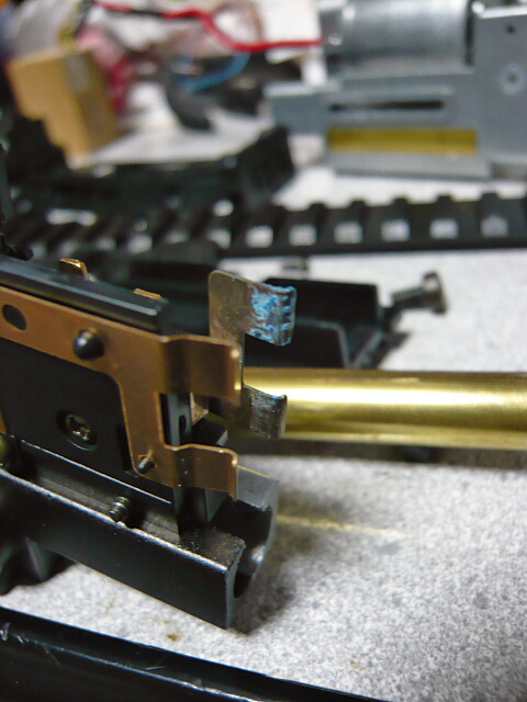 この銃、割とつまらんトラブルが多いです。バネの左にあるヒューズも切れていますが、何度も切れるのでアルミテープをヒューズの外面に貼って直結させてしまいました。