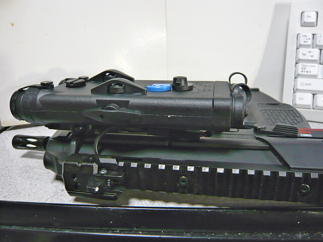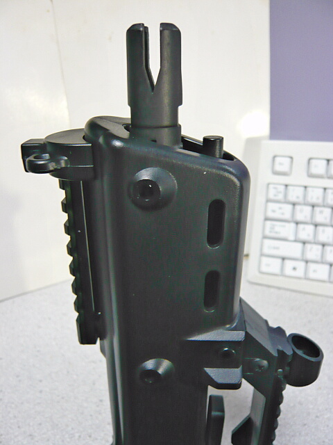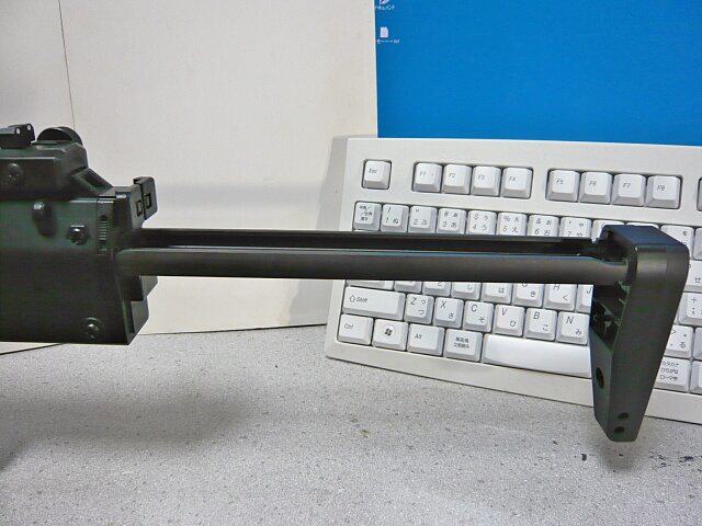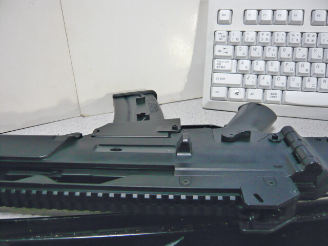 伸縮ストックは同じH&KのG3やMP5でおなじみの形状。たたんだ時に非常にコンパクトでその状態でも射撃の邪魔にならない良ストック。付け根右側に操作スイッチがありますがちょっと小さくてMP5などのものに較べると操作性はイマイチ。ポジションは最短と最長の2ポジションのみ。左右に折るタイプのストックがあまり好きではないのでこのタイプの折りたたみストックの銃ばかり持っていました。