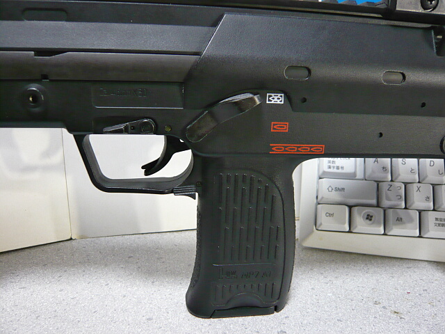 セレクターはMP5などと同様の、H&Kの銃ではおなじみの左右に貫通している操作性の高いもの。握った親指で容易に操作でき、クリック感も良好です。トリガーにはグロック17のようなトリガーセーフティがあり、不意にトリガーに触れたりして誤射するのを防いでいます。マガジンキャッチは左右に取り付いておりハンドガン感覚で操作できますが、やや抵抗がありストンとは落ちてきません。トリガー上にあるボルトリリースレバーはダミーですがヘコヘコ可動します。