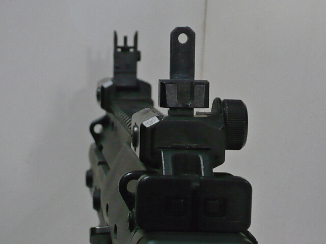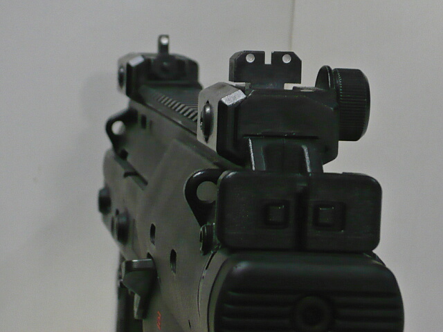前後サイトは可倒式で倒した状態ではハンドガンタイプのサイトとして機能します。ストックをたたんだ状態でグリップを握った腕を伸ばしてサイティングする時はこちら。