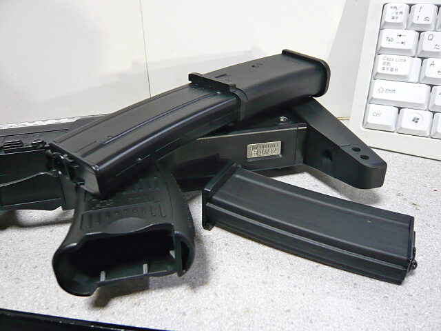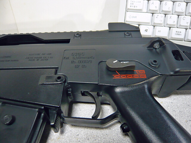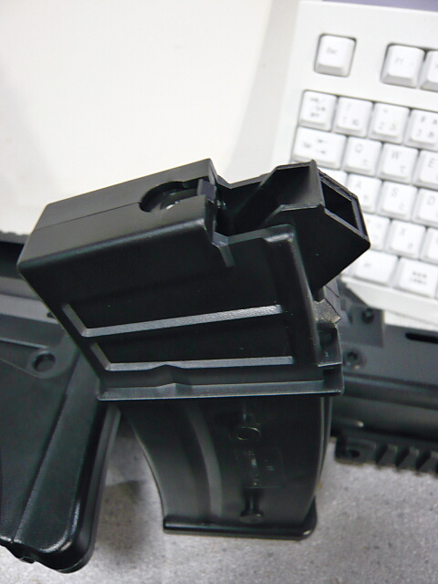 マガジンキャッチの操作はMP5やG3と同じくレバーを親指で握りながらマガジンを握って真下へ抜きます。AK47等とは違い前軸ではないのでよく動画であるようなマガジン上端でマガジンキャッチを押すような操作はしないように。