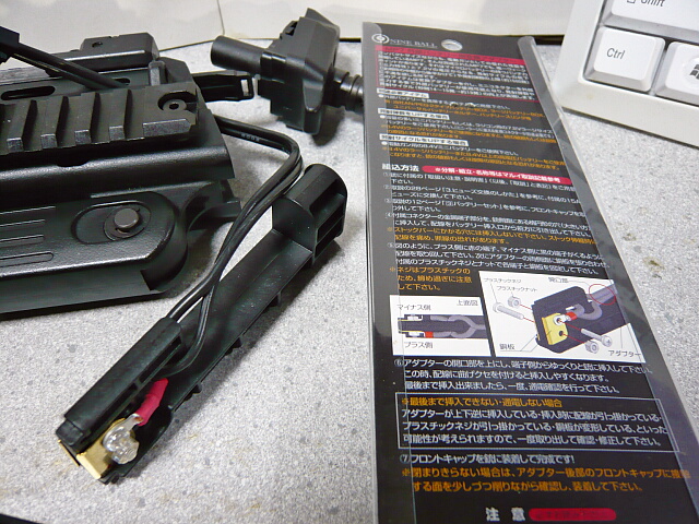 パッケージ裏の説明書を見ながらアダプターに配線を透明なプラネジで接続し、配線をねじったりひねったりしてアダプター本体を銃に収めます。やっぱりマイクロバッテリーEXに戻したい、という時はこの逆を行います。着脱のたびにうっかり失くしそうなネジをバラす必要がありちょっと煩わしい・・・