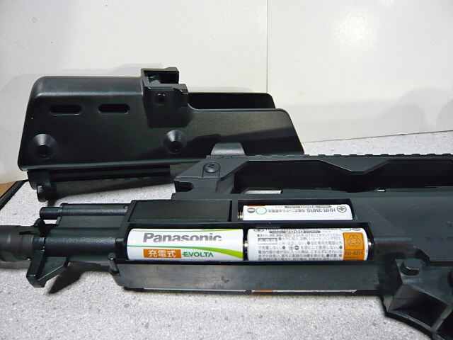 フロントサイトの下にある◎状の突起を右側から押し込みながらハンドガードを銃口側へ引っ張るとややキツいながらも外れ、電池ボックスが現れます。単三電池6本9Vですが、画像は充電池なので合計7.2V。低パワーなので7.2Vでもコンパクト電動よりはサイクルが速めで軽快に動作します。セミオートの切れもまあまあ良いです。