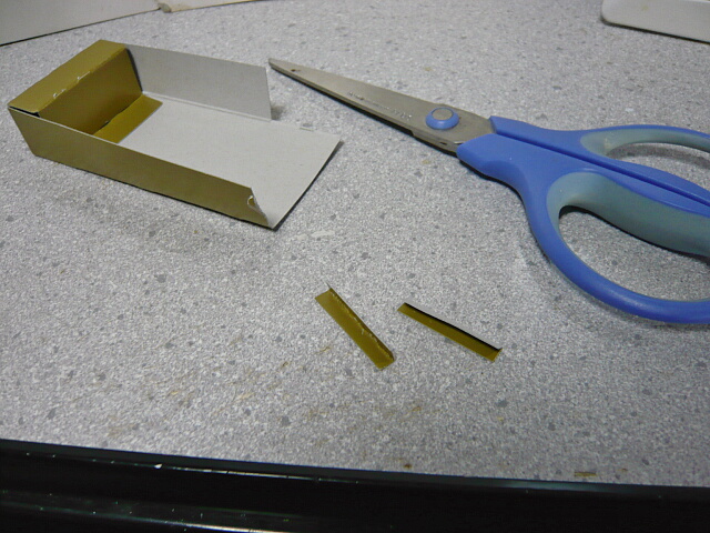 こんなものにプラ板を消費するのは勿体無いので、取り出したるはゴミ入れからクランキーチョコの空き箱。これを幅1cm長さ適当に切り出し、幅1cmを半分にするように折り目をつけます。