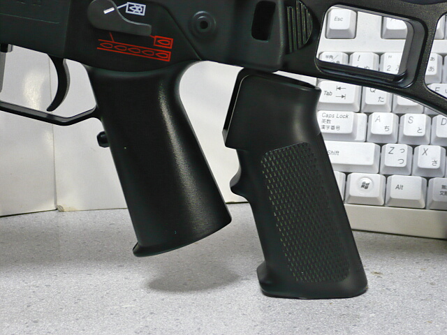 グリップは全体の縮小に合わせ小ぶりで、握り心地はちょっと細短すぎて残念な感じ。右のM4グリップはスタンダード電動M4A1のものですが、見た目以上にBOY’S G36Cのグリップは小さく感じます。