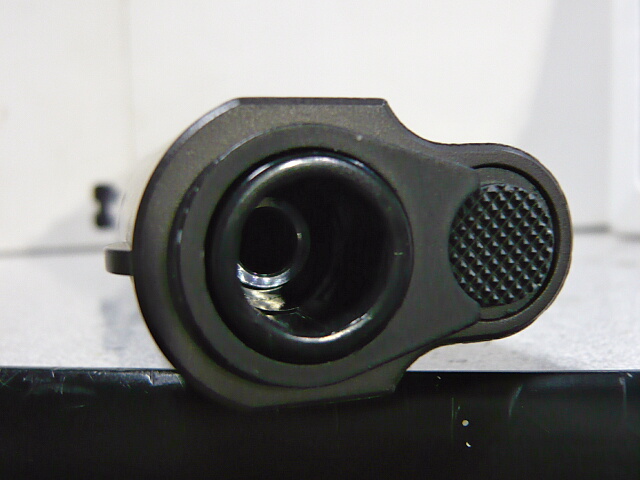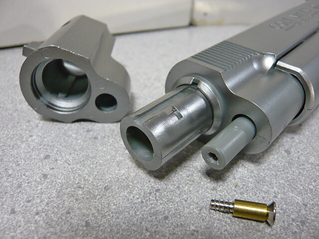 銃口の下にあるギザギザの付いた部分(リコイルスプリングプラグ)を押してそこに噛んでる銃口周りのリング状パーツ(バレルブッシング)を回してはずし、バレルを前に抜くのが本来の方法ですが、プラグとブッシングが一体になっています。旧タイプでは前から差し込まれて左右の爪で止まってるだけだった記憶ですが、こちらもそうなってるのでしょうか?何かキズ入れちゃいそうなのでやめておきます。