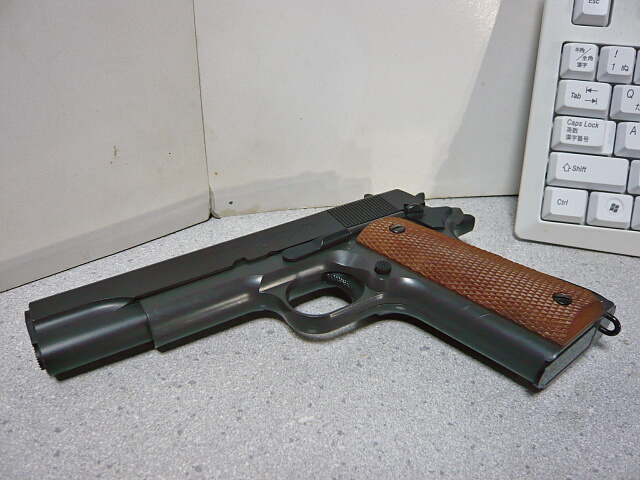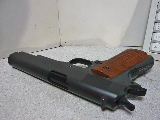 マルイのエアコキガバメントはかなり昔からラインナップにありますが、こちらはかなり後になってリニューアルされたタイプ。旧バージョンはスライド内のシリンダーが太く長くそれに合わせて銃のスタイルが太く不恰好だったのですが、こちらはほぼ実銃と同じ姿を再現しています。色は黒ではなく赤錆の混じったような茶色みがかったダークグレーの本体に、木目調のプラ製グリップパネル。