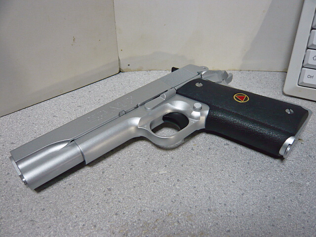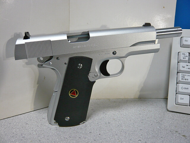 このウェスタンアームズ(以下WA)のデルタエリートはヘビーウェイトのシルバーモデル。WAのトイガンはどれも高いのですが、これは1万円と破格値で売られていたので飛びつきました。