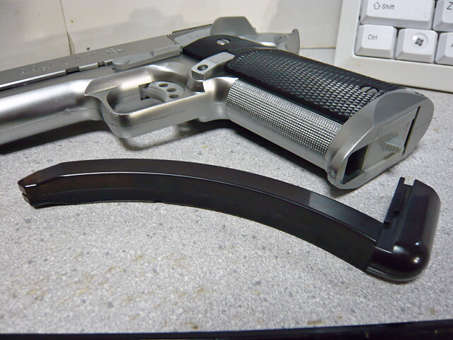 マガジンは亜鉛合金製でこれもガスブローバックガンのご他聞にもれず重くて冷たい。ガバメント系のマガジンは細いのでガスの冷えには弱いです。仕方ないところです。