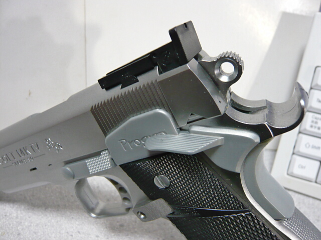 グリップの左右にあるセーフティレバーはその前にあるProgripと刻印のあるパネルとスライドストップと一体でダミー。グリップ後面にあるグリップセーフティは可動しますが、ビーバーテイル(ハンマーとグリップセーフティの間にある突き出た部分)とは分割されており可動方向も上軸ではなくそのまま垂直に押されるだけになっています。