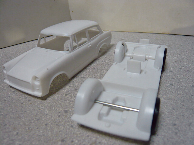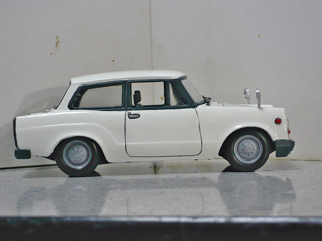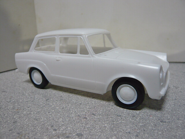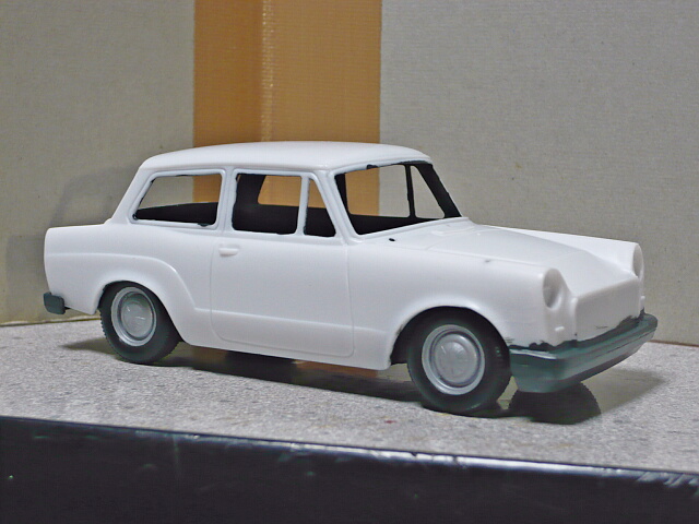 どう作ろうか?と思案しているとそういえばこの形何かに似ているなぁ・・・と思ったら旧東ドイツの名車トラバントに大まかな全体形が似ています。そこでググってトラバントの末期型を参考に、この形のまま90年代まで生産されてたらこんな感じだろうか?というモダナイズを妄想してみました。というわけで樹脂バンパー。