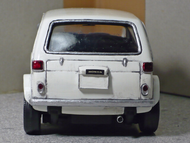ボディ裏をつや消し黒で塗り、窓枠やランプ類を塗ったりした段階。
