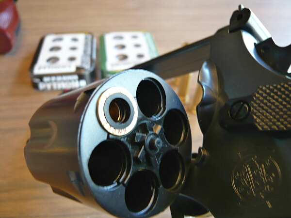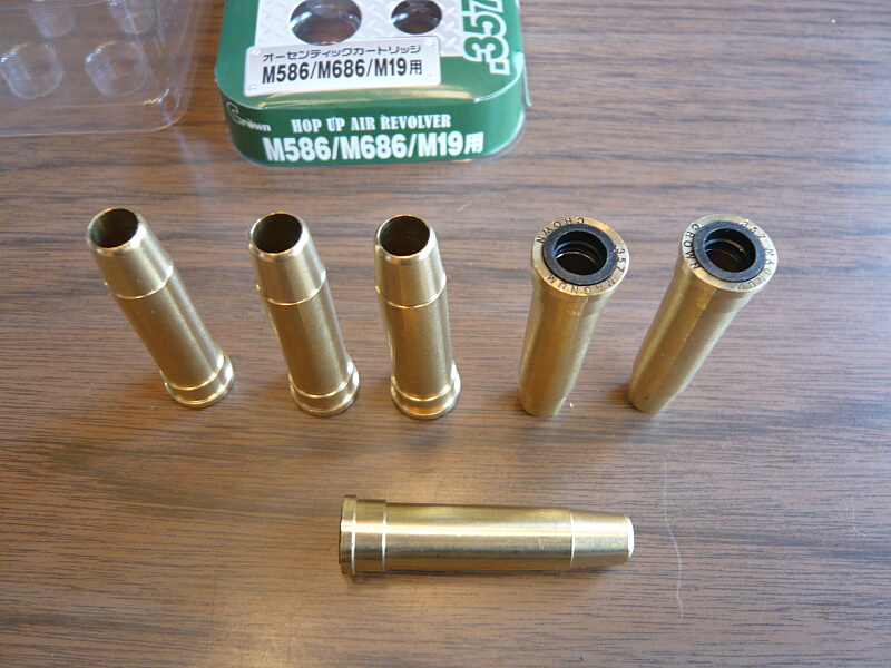 標準のプラ製カートを形状そのまま真鍮に置き換えただけなので初速などは変化しません。パイソンではトリガーを引いてシリンダーを回転させると少し勢いがよくなりますが、M19はシリンダー前面と接するフォーシングコーンがスプリングのテンションでシリンダー前面の穴に可動してはまり込んでいるのでトリガーの引き始めに引っ掛かりがあり、イマイチ回転させて楽しい感じはありません。パイソン同様に真鍮カートがシリンダー内でわずかに前後に遊ぶので銃を揺するとカートがガチャガチャ音を立てがち。