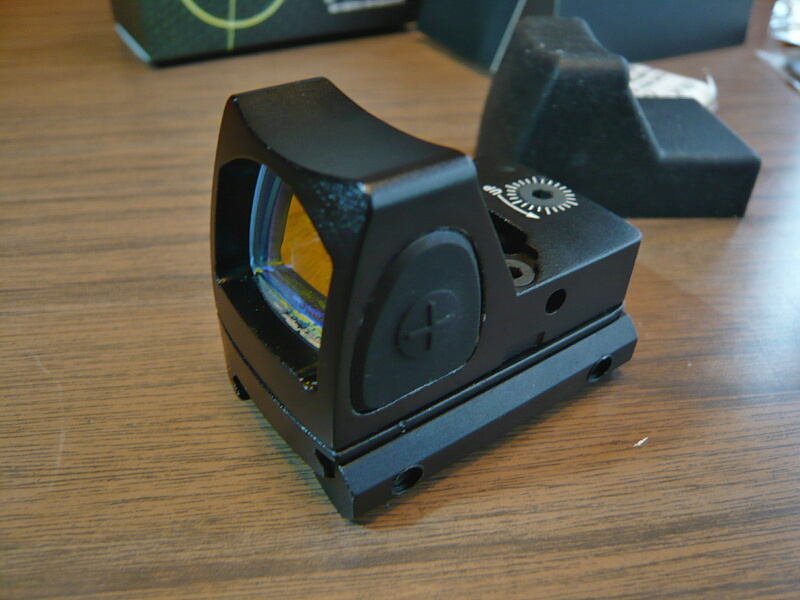 本体。オープンタイプの小さなドットサイトで、外装は金属製。レンズの周囲を覆っている部分には右に+、左に-の刻印があるボタンがあります。