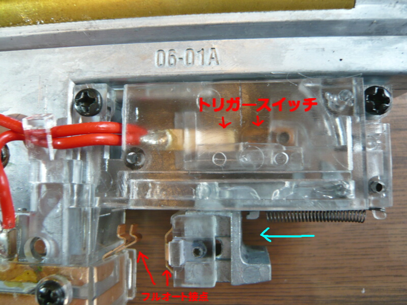 トリガーメカはメカボックスの外側に透明なケースに収められて取り付いています。ブルパップ銃なのでトリガーを引くとワイヤーロッドを介して上写真の青矢印の位置を後方へ押し、トリガースイッチを動かします。
